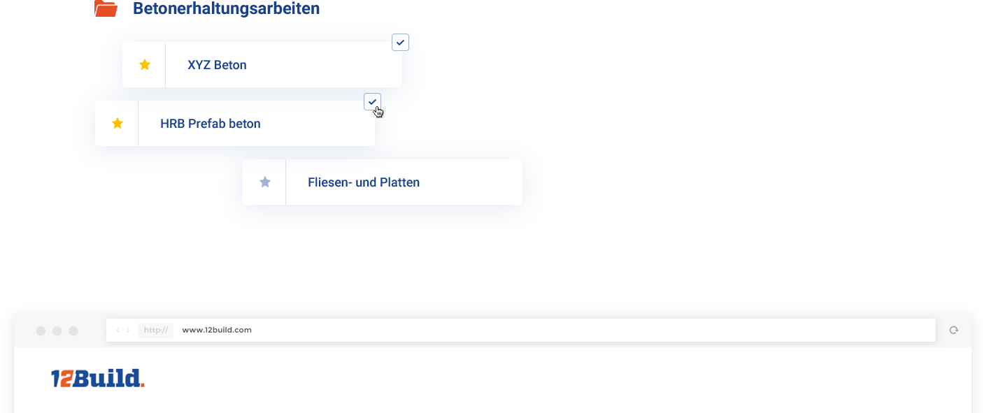 Sie können bequemer arbeiten als je zuvor. Wir haben die zahllosen Nachunternehmen und Lieferanten, aus denen Sie wählen können, nämlich für Sie zusammengestellt. Dadurch sparen Sie viel Zeit für die Suche im Internet, da alle Informationen in 12Build Matchmaker übersichtlich aufgeführt sind. In der Datenbank finden Sie die richtige Kontaktperson inklusive E-Mail-Adresse. Die Daten werden täglich von einer Gruppe von Datenbankexperten kontrolliert.