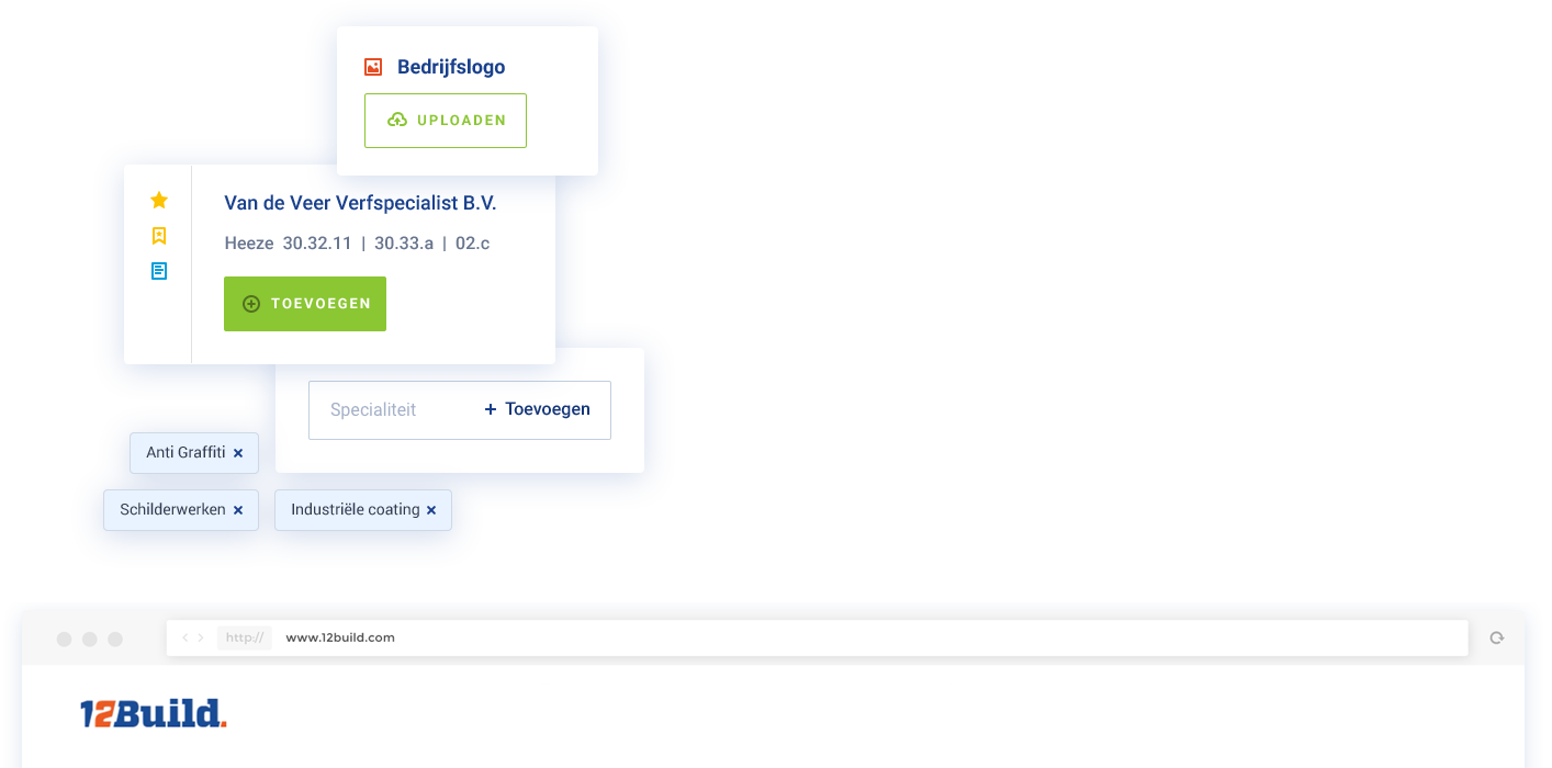 Zoekt iemand op jouw organisatie? Dan toont 12Build Activator een volledig en professioneel bedrijfsprofiel. Met onder andere je logo, een profieltekst en een link naar je website. Vul je bedrijfsprofiel verder aan met bedrijfsvideo’s, specialisaties (STABU, RAW), referentieprojecten, certificaten, keurmerken en dealermerken. Zo sta je met 12Build Activator op een professionele manier in de grootste online database van de Europese bouw.
